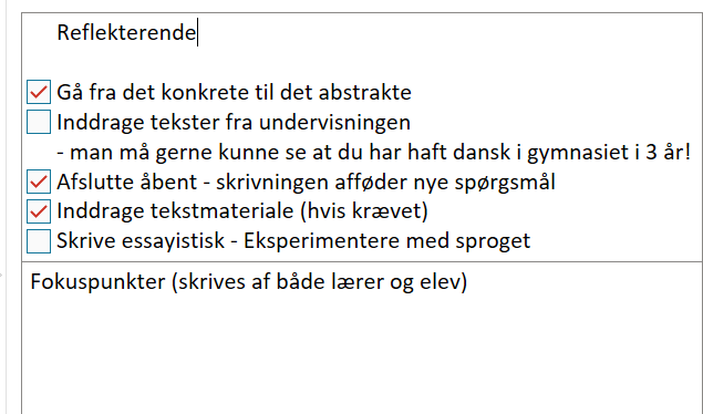 | Analyse med fagbegreber og mindst 2 PEE-afsnit | (markér fagbegreber med grønt) (marker, pointe, belæg og forklaring (forskellige farver) | ||