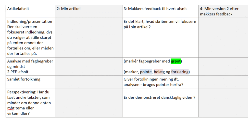 | Artikelafsnit | 2: Min artikel | 3: Makkers feedback til hvert afsnit | 4: Min version 2 efter makkers feedback |